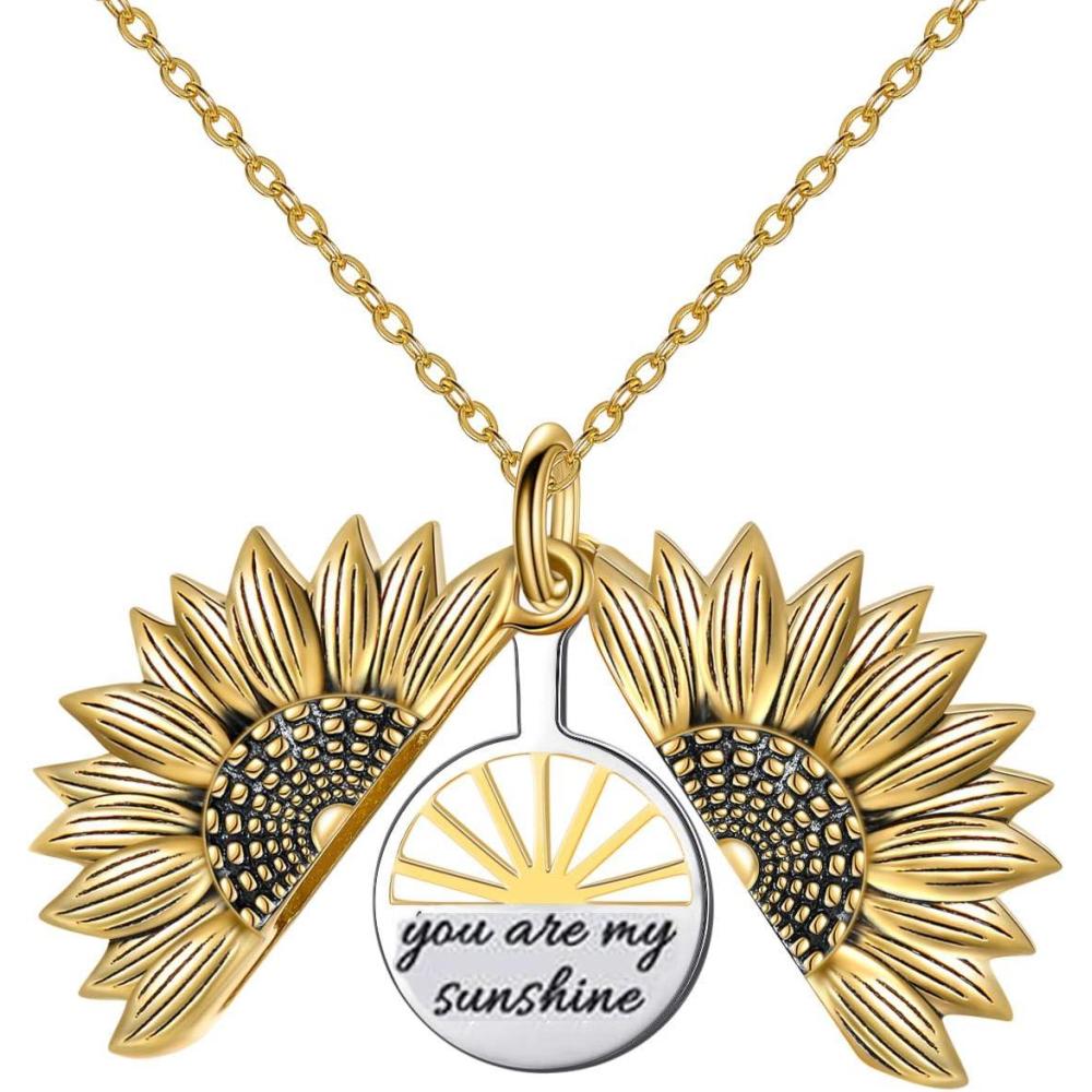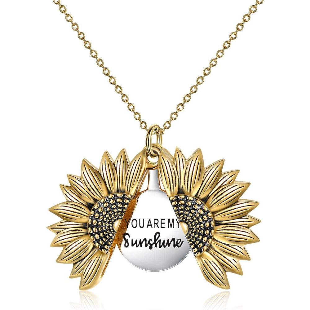 Sterling Silver Sunflower Locket Necklace You Are My Sunshine Engraved Pendant Necklaces Anniversary Jewelry for Her(B-Sunrise Gold)