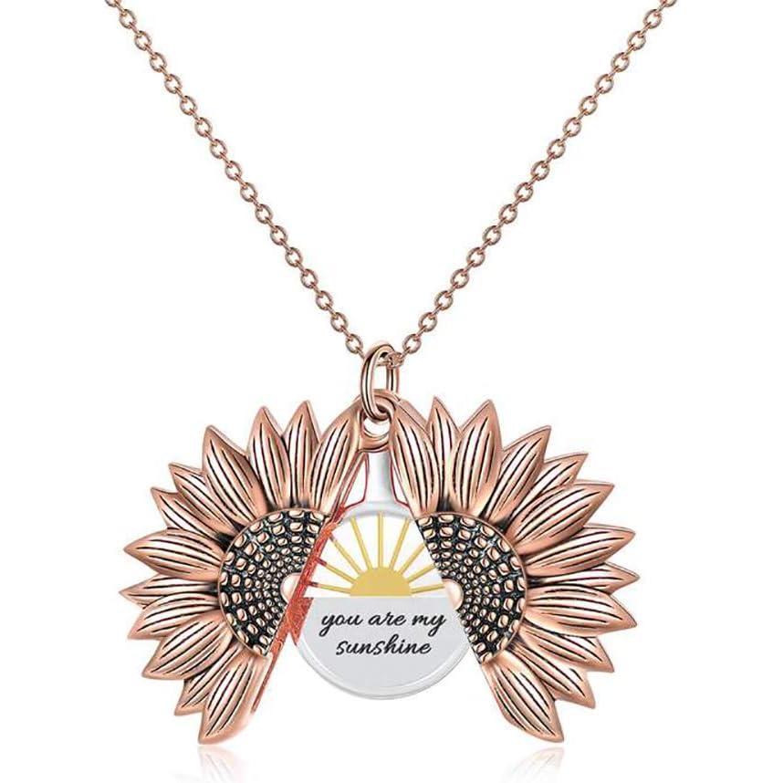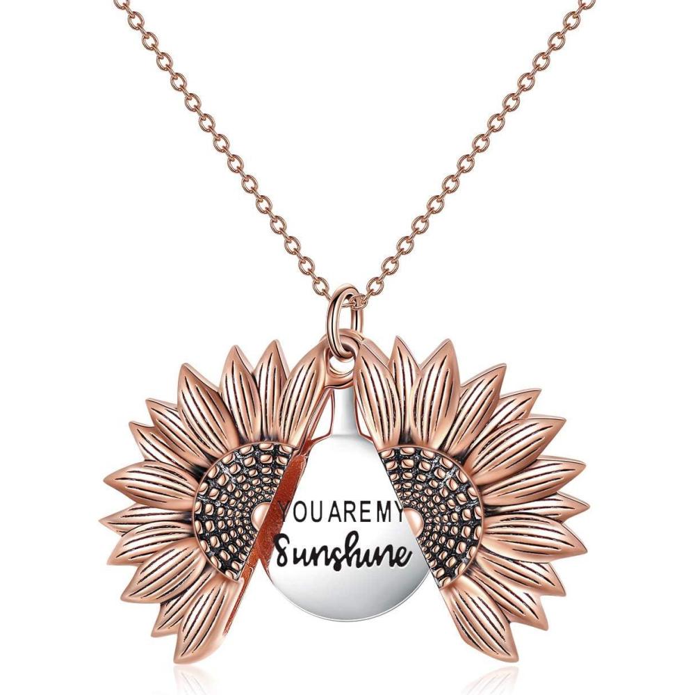 Sterling Silver Sunflower Locket Necklace You Are My Sunshine Engraved Pendant Necklaces Anniversary Jewelry for Her(A- Rose Gold)