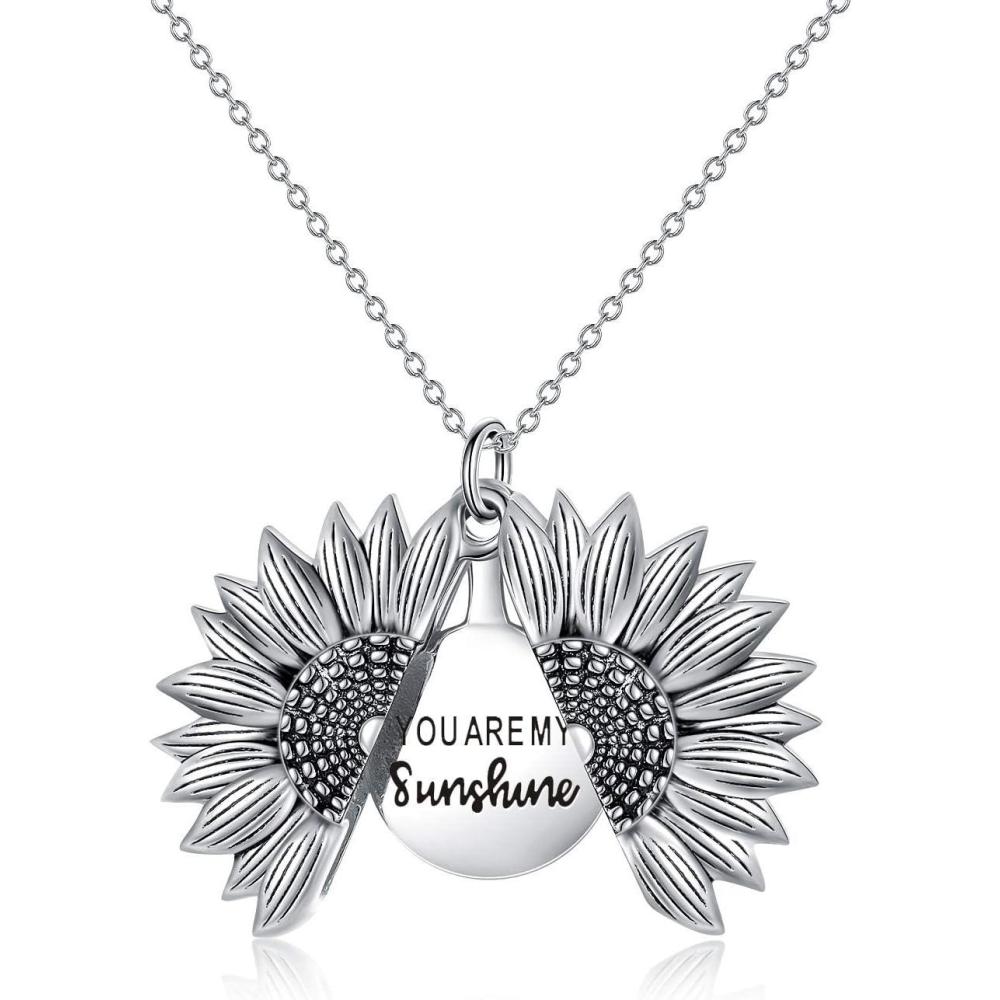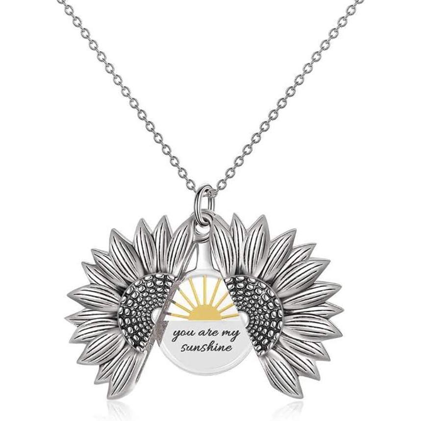 Sterling Silver Sunflower Locket Necklace You Are My Sunshine Engraved Pendant Necklaces Anniversary Jewelry for Her(A- Silver)