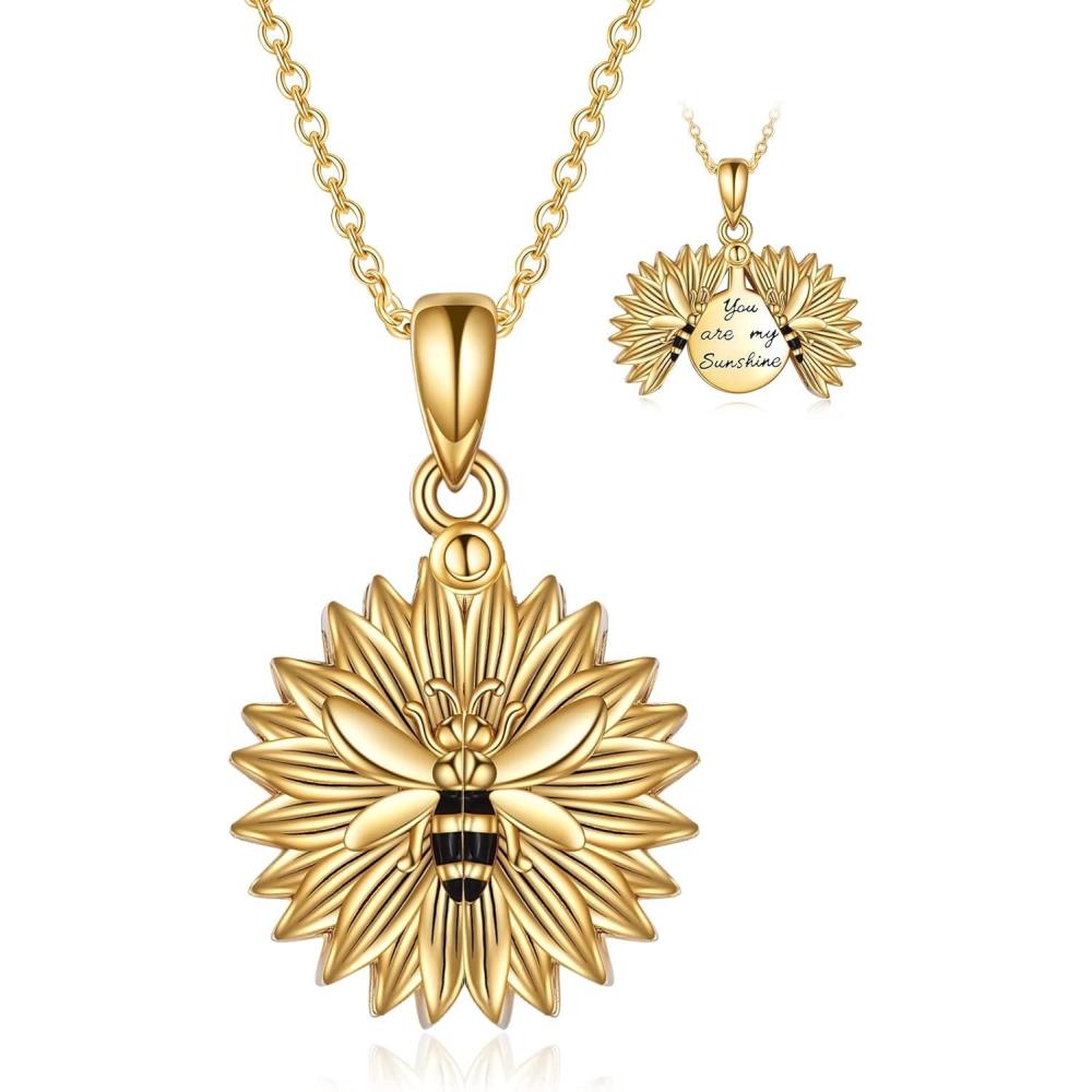 Sterling Silver Sunflower Locket Necklace You Are My Sunshine Engraved Pendant Necklaces Anniversary Jewelry for Her(C-Bee Gold)