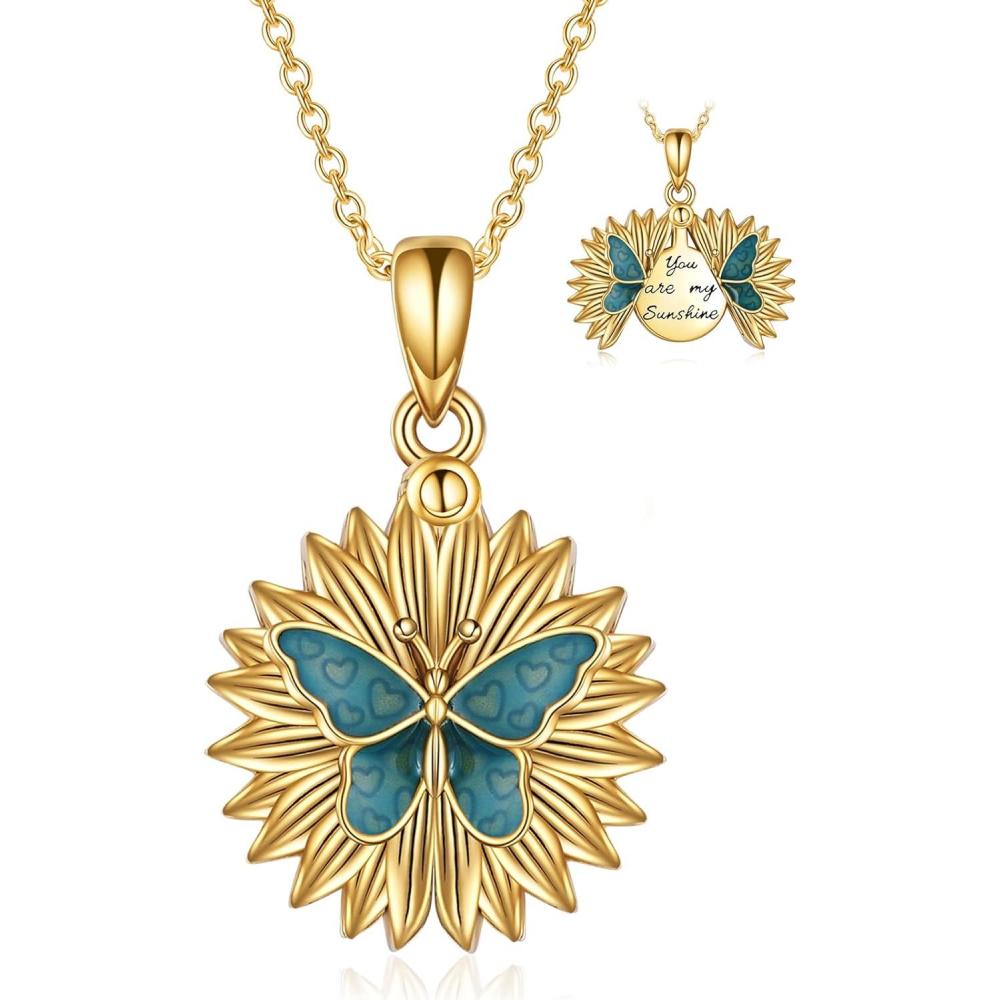 Sterling Silver Sunflower Locket Necklace You Are My Sunshine Engraved Pendant Necklaces Anniversary Jewelry for Her(C-Butterfly Gold)