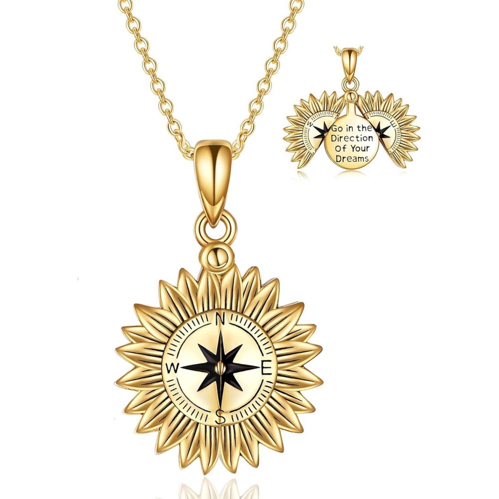 Sterling Silver Sunflower Locket Necklace You Are My Sunshine Engraved Pendant Necklaces Anniversary Jewelry for Her(C-Compass Gold)