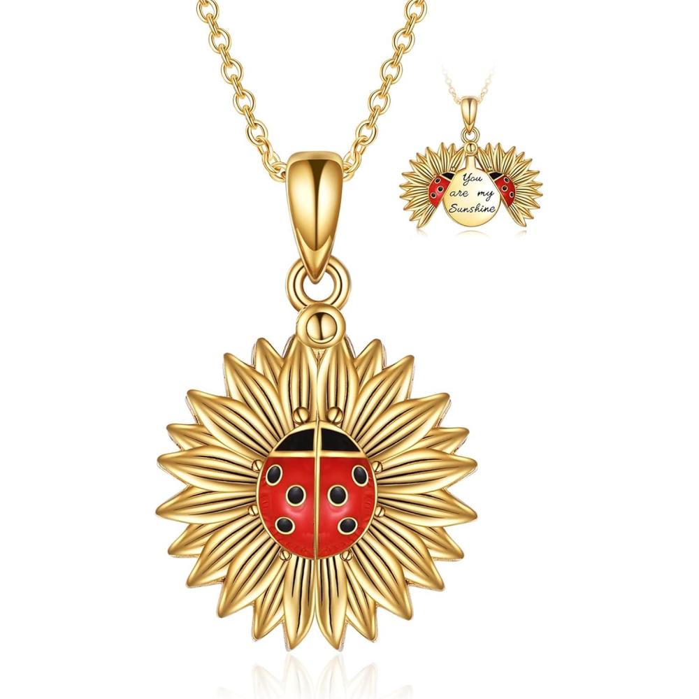 Sterling Silver Sunflower Locket Necklace You Are My Sunshine Engraved Pendant Necklaces Anniversary Jewelry for Her(C-Ladybug Gold)
