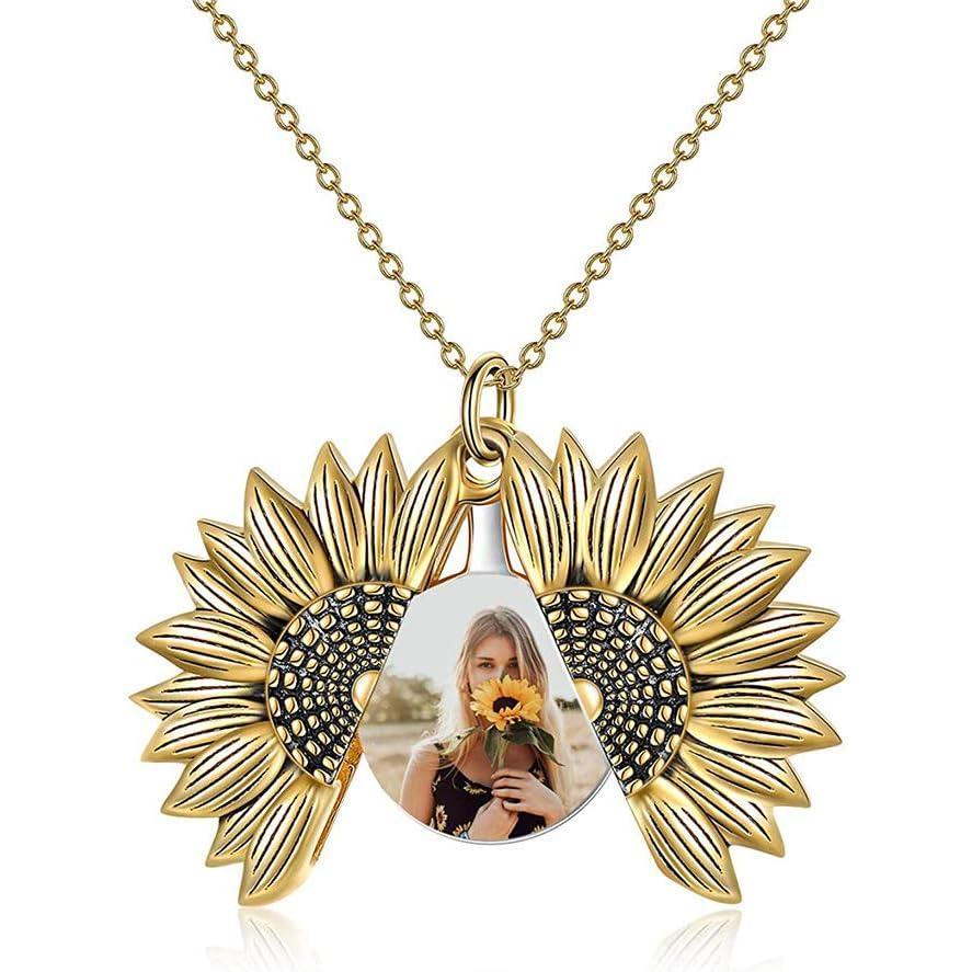 Sterling Silver Sunflower Locket Necklace You Are My Sunshine Engraved Pendant Necklaces Anniversary Jewelry for Her(D-Photo Locket- Gold)