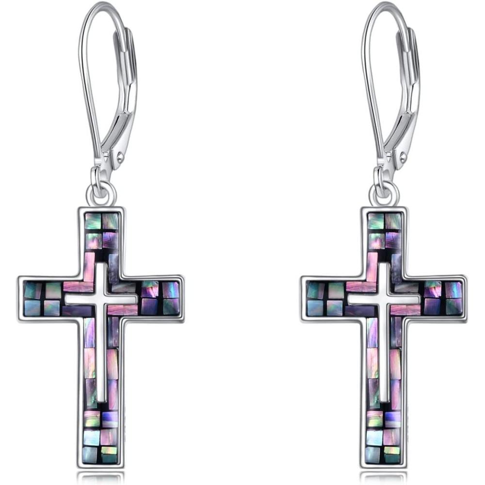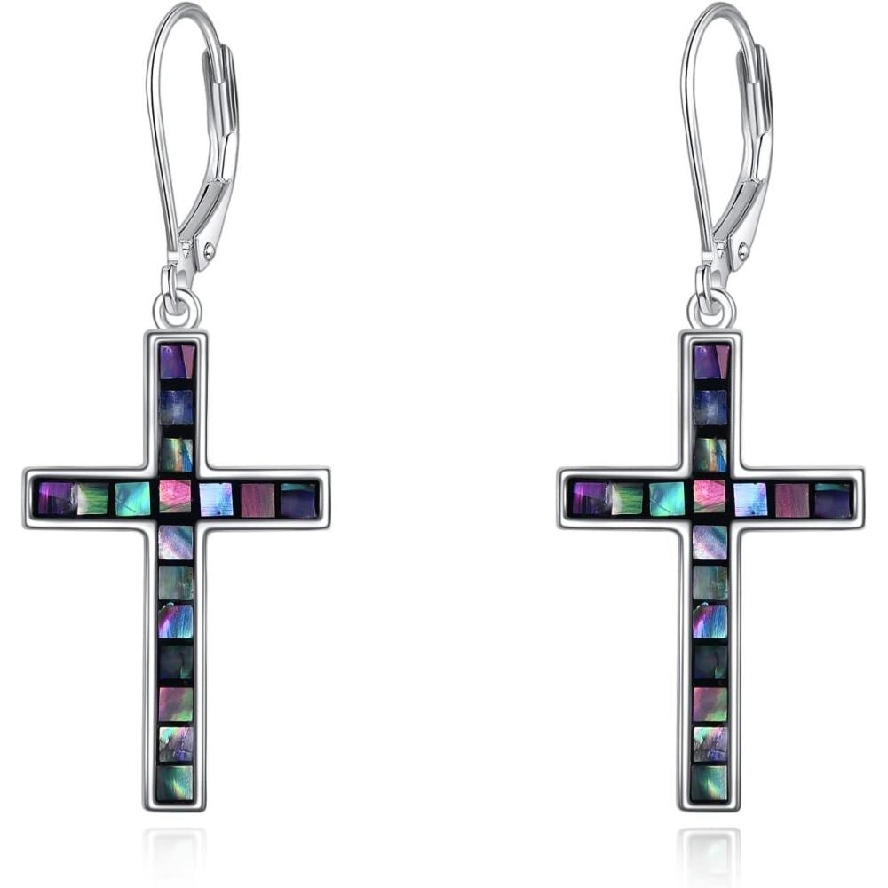 YFN Cross Earrings Sterling Silver Dangle Drop Leverback Cross Earrings Religion Jewelry Christians Gifts for Women Men(B-Abalone Shell)