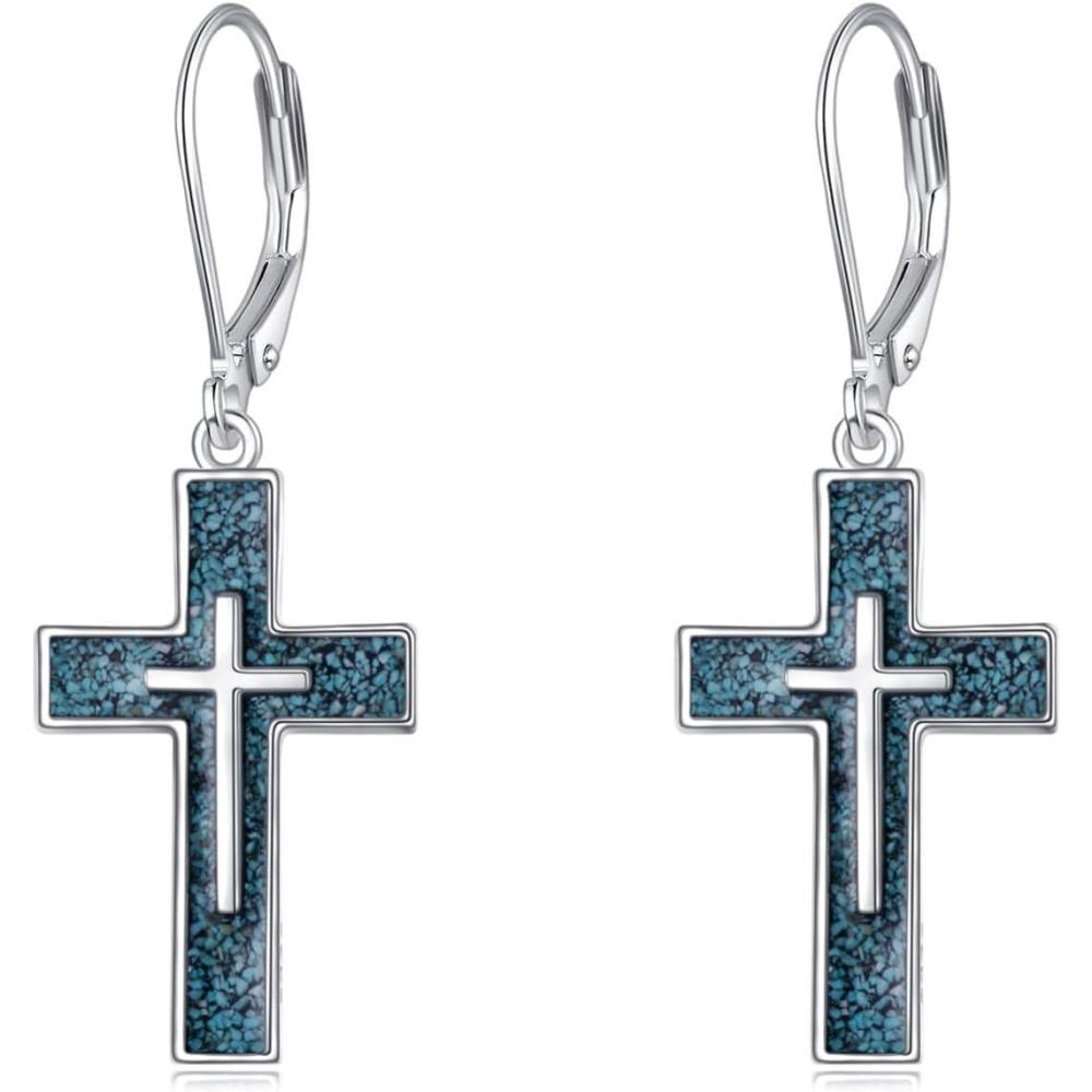 YFN Cross Earrings Sterling Silver Dangle Drop Leverback Cross Earrings Religion Jewelry Christians Gifts for Women Men(B-Turquoise)