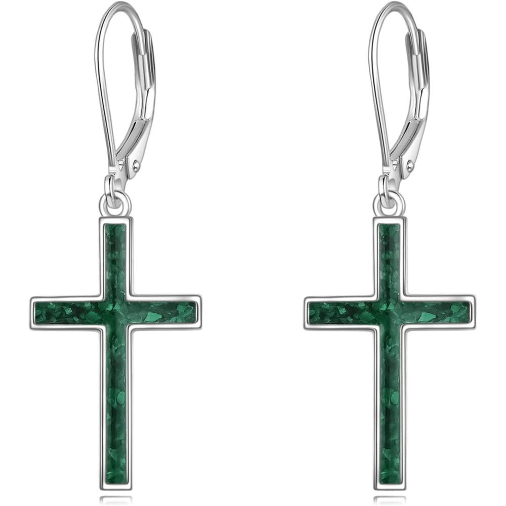 YFN Cross Earrings Sterling Silver Dangle Drop Leverback Cross Earrings Religion Jewelry Christians Gifts for Women Men(B-Green Malachite)
