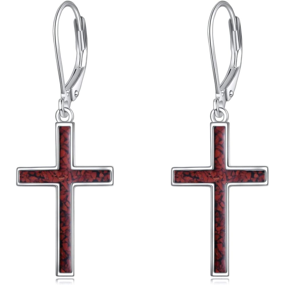 YFN Cross Earrings Sterling Silver Dangle Drop Leverback Cross Earrings Religion Jewelry Christians Gifts for Women Men(B-Red Coral)