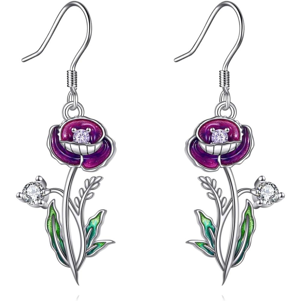 YFN Birth Month Flower Drop Dangle Earrings S925 Sterling Silver Birthday Jewelry Gifts for Women(Drop-Aug.Poppy Earrings)