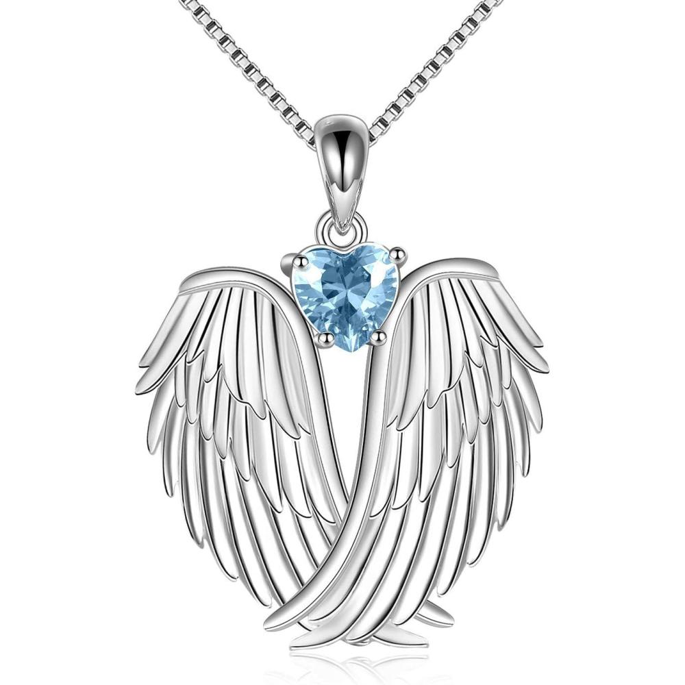 YFN Angel Wings Necklace 925 Sterling Silver Guardian Angel Wings Pendant Necklace Birthstone Necklace for Women Girls Christmas Jewelry Gifts(March-Blue)