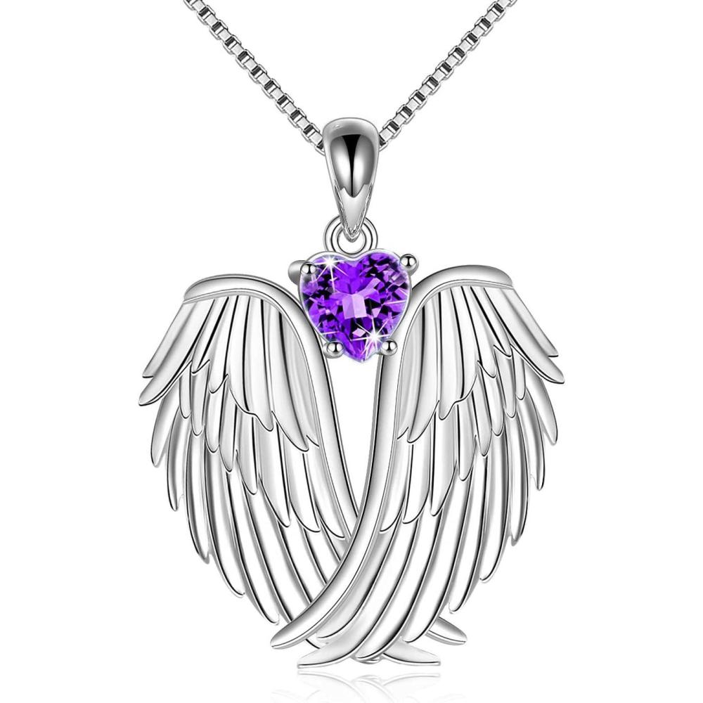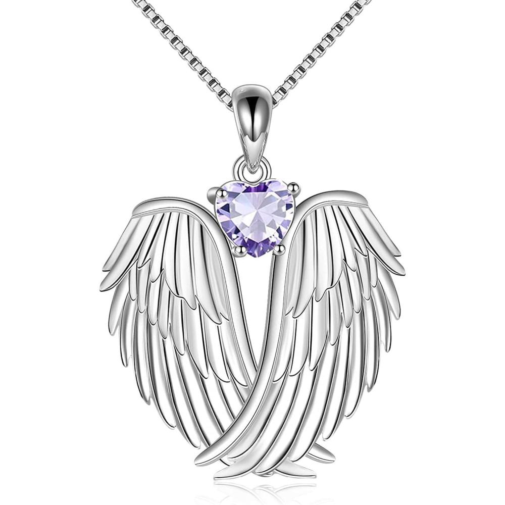 YFN Angel Wings Necklace 925 Sterling Silver Guardian Angel Wings Pendant Necklace Birthstone Necklace for Women Girls Christmas Jewelry Gifts(February-Purple)