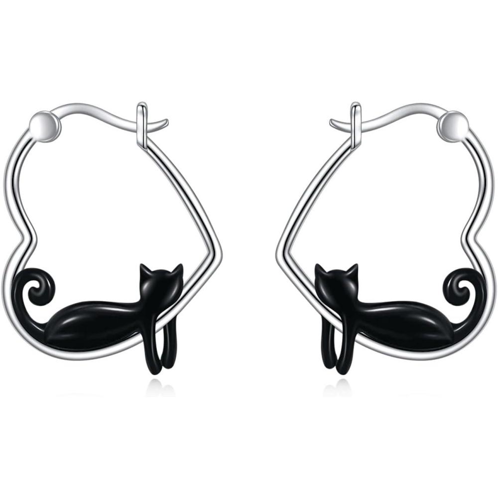 YFN Animal Earrings Sterling Silver Animal Heart Hoop Dangle Earrings Cute Jewelry Gifts for Women(Black Cat)
