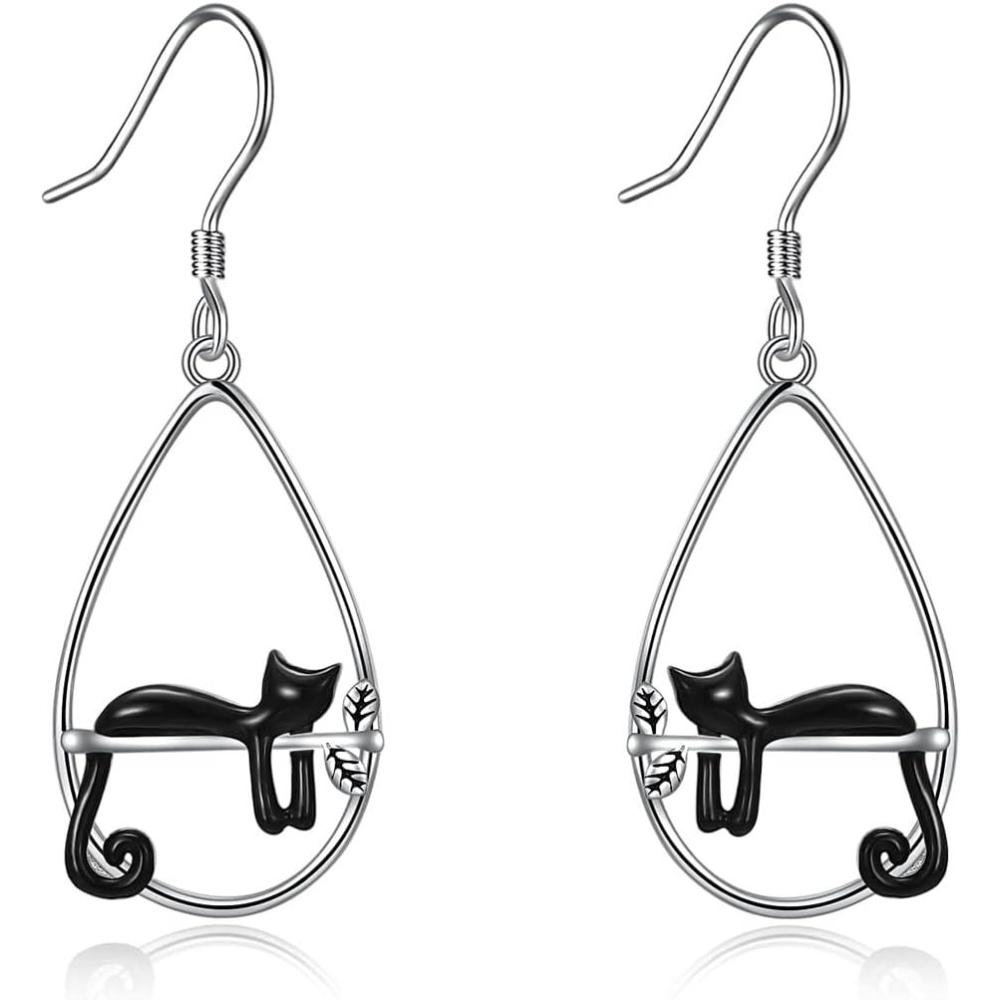 YFN Animal Earrings Sterling Silver Animal Heart Hoop Dangle Earrings Cute Jewelry Gifts for Women(Black Cat Dangle)