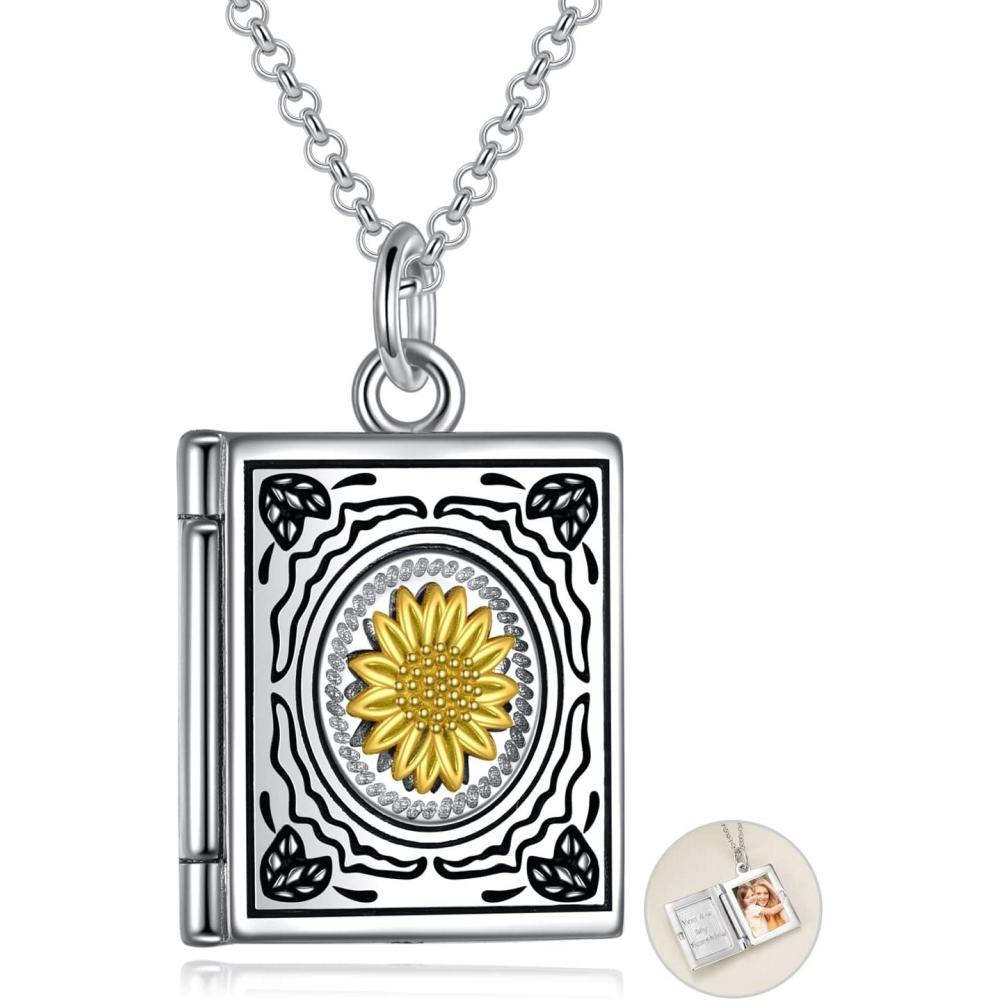 Photo Locket Necklace 925 Sterling Silver Book Necklace that Holds Pictures Birthday Gifts for Women Mom(Book with Sunflower)