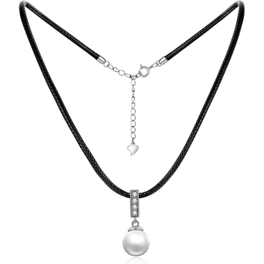 Sterling Silver Pearl Choker Necklace With Faux Leather Cord Chain – Jewelry Gift for Women, 14 2″